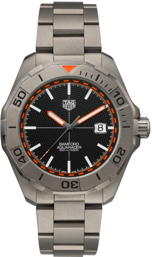 Модель Limited Edition Aquaracer с циферблатом черного цвета разработана в сотрудничестве с Bamford Watch Department. Корпус диаметром 43 мм отличается сверхлегким весом, а вращающийся в одном направлении безель с 60-минутной шкалой и 3-рядный браслет выполнены из сверхпрочного титана Grade 2. Узнаваемый стиль Bamford проявляется в элегантном черном циферблате, на котором в положении «6 часов» указано название знаменитого британского дома. Номер ограниченной серии нанесен на завинчивающуюся заднюю крышку из титана (степень 2). Стрелки цвета черного золота и оранжевого цвета, а также нанесенные индексы обработаны белым люминофором Superluminova® для легкого чтения при любом освещении и на любой глубине. Водозащита 300 метров. Функции: часы, минуты, секунды, дата.