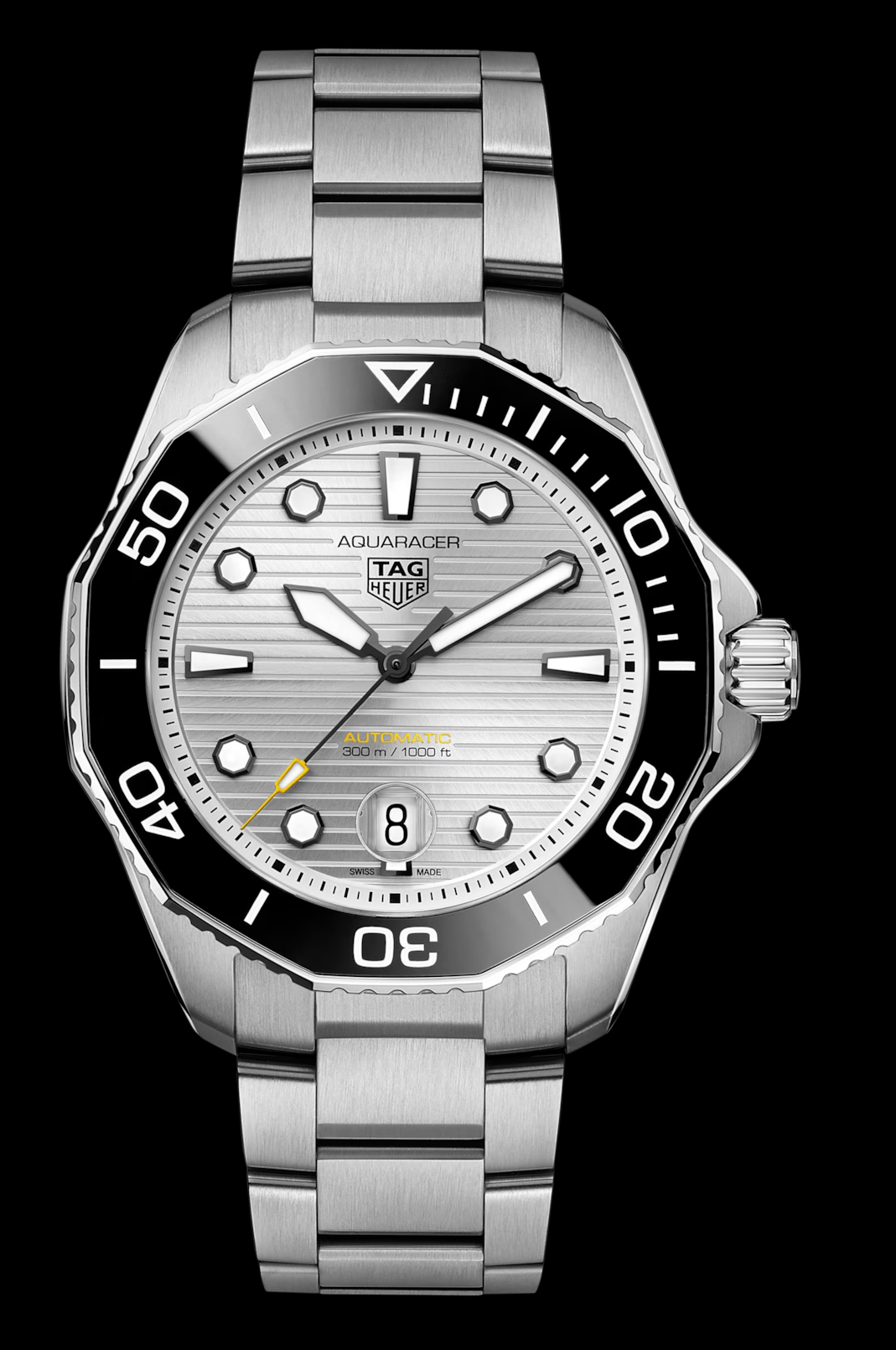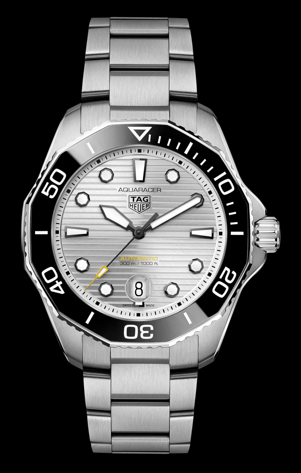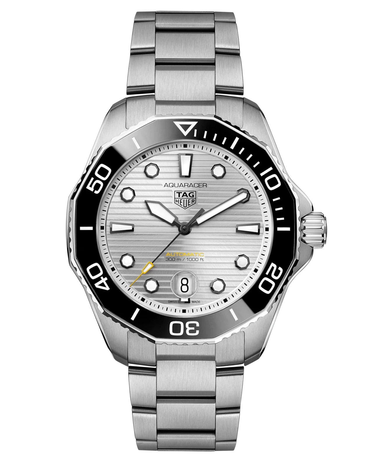 Новая специальная серия TAG Heuer Aquaracer с ярко-серебристым матовым циферблатом с полировкой «солнечные лучи» - настоящие часы для дайвинга. На черные стрелки и часовые метки нанесено белое покрытие Super-LumiNova® для превосходной считываемости показаний. Корпус 43 мм из матовой и полированной стали с более тонким профилем дополнен вращающимся в одном направлении черным керамическим безелем. Прочный внешний вид и культовый дизайн. Завинчивающаяся заводная головка, предотвращающая попадание воды, уменьшена для работы в самых тяжелых условиях. Герметичность и водозащита до 300 м. Конический стальной браслет с предохранительными кнопками на застежке и системой точной регулировки создан для экстремальных ситуаций. Сверхмощный инструмент для покорения морских глубин.
