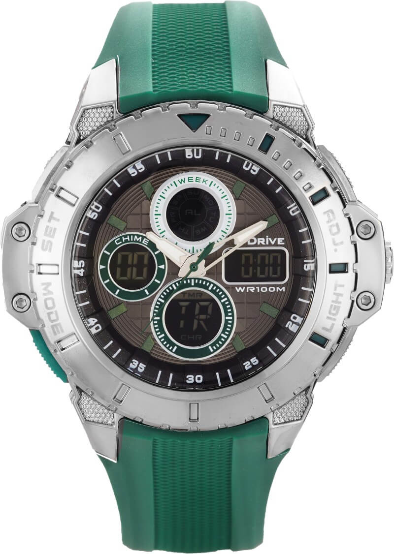 Производство:Гонконг. Размер корпуса:50 мм. Материал корпуса: пластик. Цвет корпуса: стальной. Материал браслета:пластик. Цвет браслета: зеленый. Механизм: кварцевый Seiko. Функции:будильник, второй часовой пояс, дата, день недели, месяц, подсветка, таймер,хронограф. Стекло:пластик. Водозащита:10 ATM.