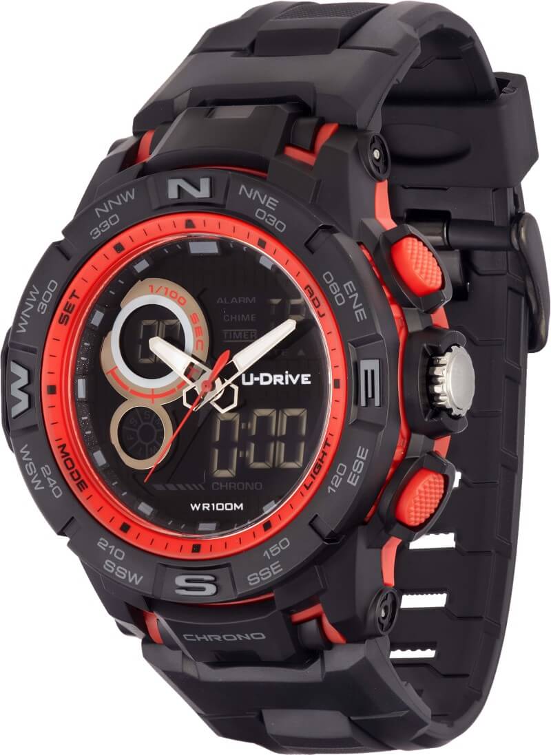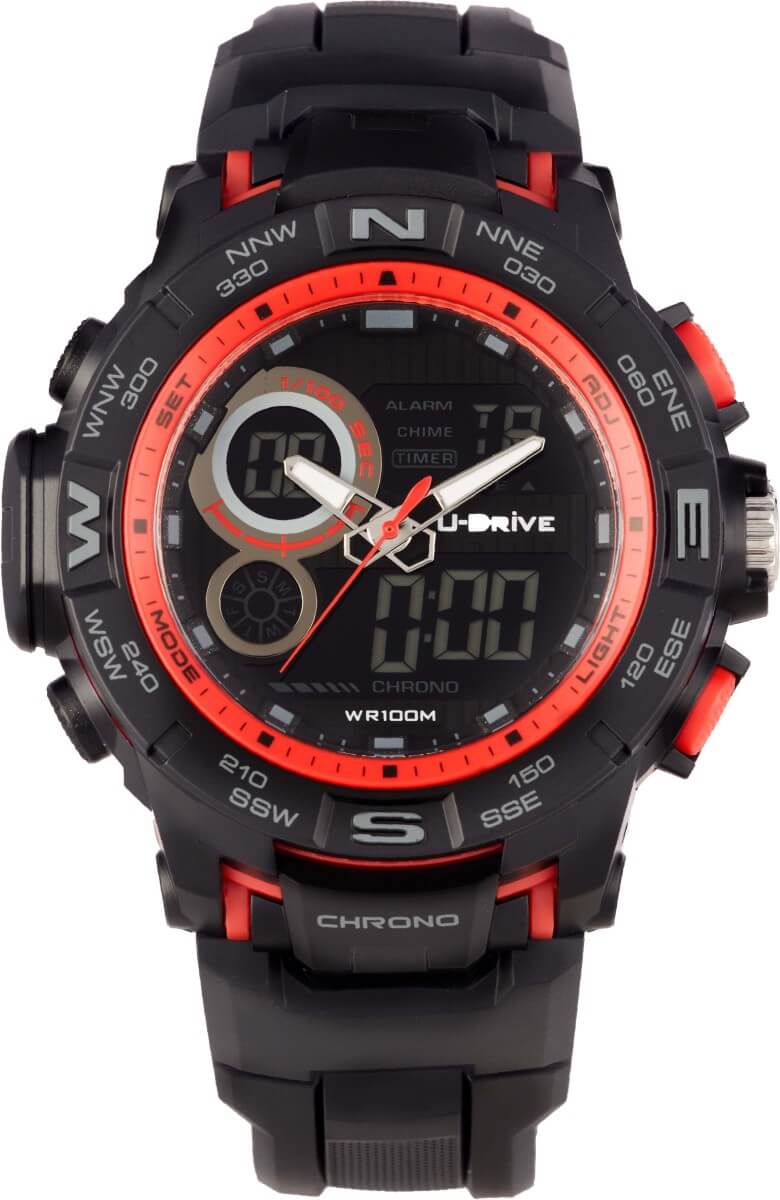 "Кварцевый механизм серии U104 предлагает самую точную информацию о времени (часы, минуты, секунды), дате, дне недели, и месяце. Кроме этого, в часах есть будильники, таймер, хронограф, второй часовой пояс. Секундомер позволяет засекает время (в том числе, несколько временных отрезков) с точностью до 1/100 секунды. Пользоваться всеми перечисленными функциями легко: потребуется четыре кнопки, размещенные по бокам корпуса. При нажатии кнопок раздается специальный сигнал, который, при желании, можно отключить. Также, можно настроить сигнал оповещения о каждом пройденном часе. Одна из кнопок включает электро-люминесцентную подсветку — цифровые индикаторы видно в любых условиях видимости. Корпус выглядит массивно, но на руке практически не ощущается: он сделан из легкого, тактильно приятного пластика. На черном циферблате тщательно продуман каждый элемент. Крупные стрелки часов и минут имеют скелетонизированную структуру и не мешают считыванию информации других индикаторов. На стрелки нанесено люминесцентное покрытие, которое светится в темноте. Секундная стрелка выделена красным - так удобнее следить за ее ходом. В часах установлено пластиковое стекло, ремешок сделан из гибкого износостойкого пластика красного цвета. Часы U-Drive – надежный спутник активных и энергичных, тех, кто выбирает экстрим и свободу. Поэтому водостойкость модели повышенная — 10 атмосфер, а задняя крышка закреплена на винтах. В часах можно плавать и заниматься водными видами спорта. Во время тренировок, походов с палатками или в клуб, просто на прогулке с друзьями — часы U-Drive везде будут уместны. Их дизайн легко сочетается со спортивной формой или любой другой повседневной одеждой."