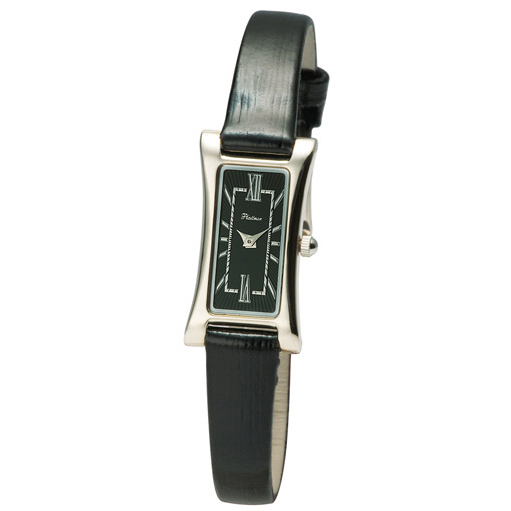 Кварцевые женские часы российской марки "Platinor". Модель "Элизабет". Корпус выполнен из белого золота 585 пробы. Вес золота 9,37 гр. Часы дополнены черным кожаным ремнем.